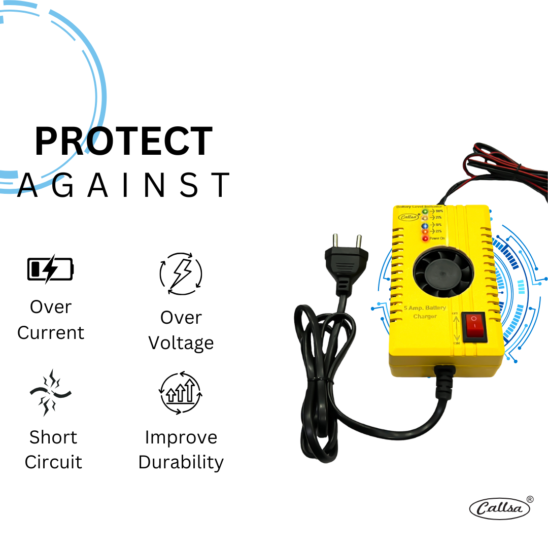 Callsa 12V 5A Fast Battery Charger with Fan Cooling, 12 Volt 5 Amp Battery Charger for Car, Bike, Motorcycle, Electric Vehicle, Auto Cut Charger and Suitable for Most Battery Types