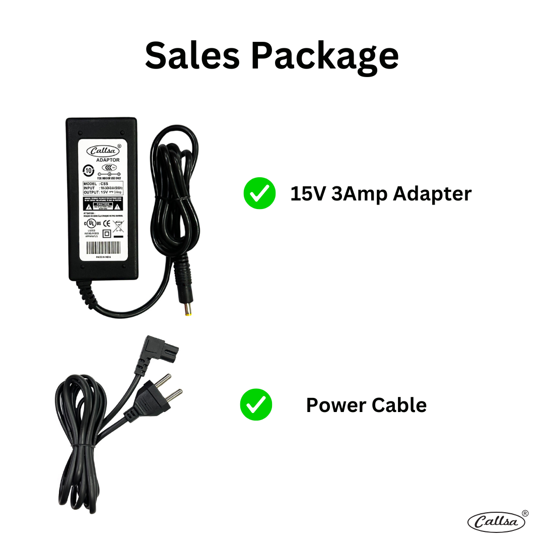 CALLSA 15volt 3amp Adapter, Power Supply, Power Adapter, SMPS for All Electronics Devices & Gadgets (Input: 220V-100Hz 100mA Output 15v 3amp) Black